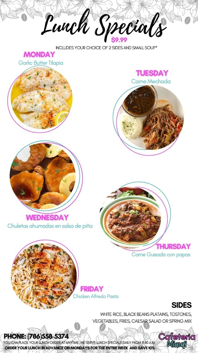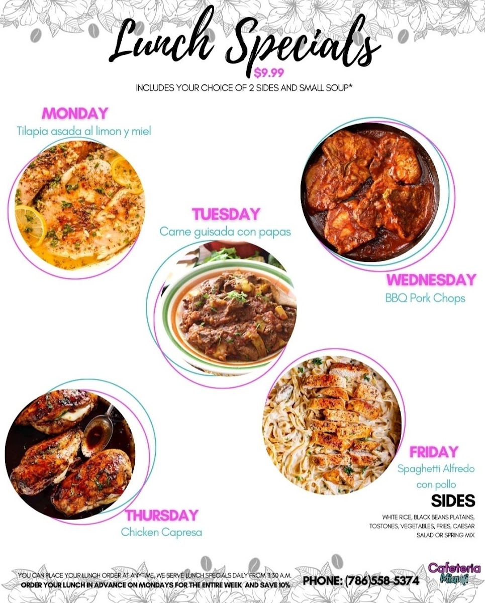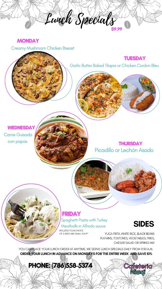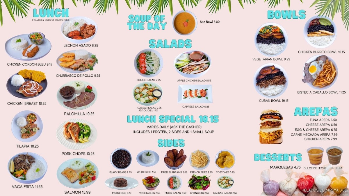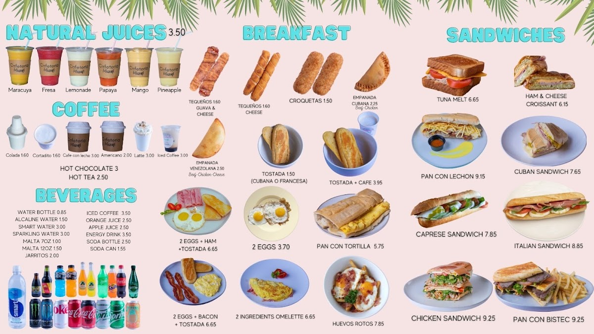 The menu at Cafeteria Miami offers a wide variety of delicious options that cater to different tastes. For those craving a savory sandwich, choices like the Croissant with Ham and Cheese Sandwich and the Pan Con Bistec Sandwich are popular picks. The Cuban Sandwich and Pan Con Lechon also make great choices for a taste of Cuban flavors. If you're in the mood for breakfast, the 2 Eggs, Ham, and Tostada or the Cuban Breakfast are excellent options to start your day. For a more filling meal, the Salmon Lunch or Palomilla Steak Lunch are satisfying, while the Chicken Cordon Bleu and Pork Chops Lunch are hearty alternatives. In addition, the restaurant offers refreshing natural juices like Strawberry Juice and Mango Juice, and a range of beverages, from Café Latte to Powerade. For dessert, don’t miss the Dulce de Leche Marquesa or the indulgent Nutella Marquesa. Whether you're stopping by for a quick bite or a full meal, Cafeteria Miami has a diverse selection to enjoy.