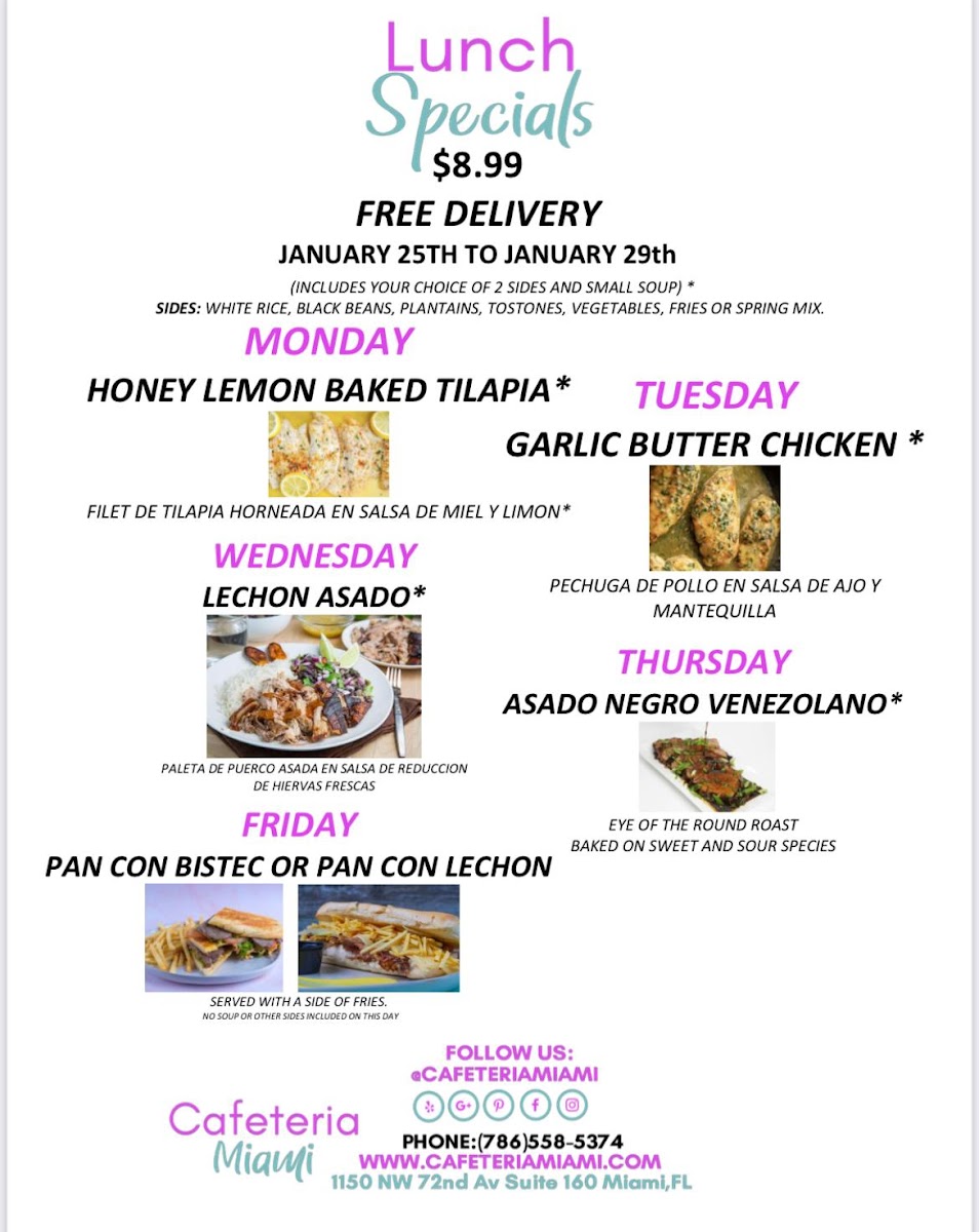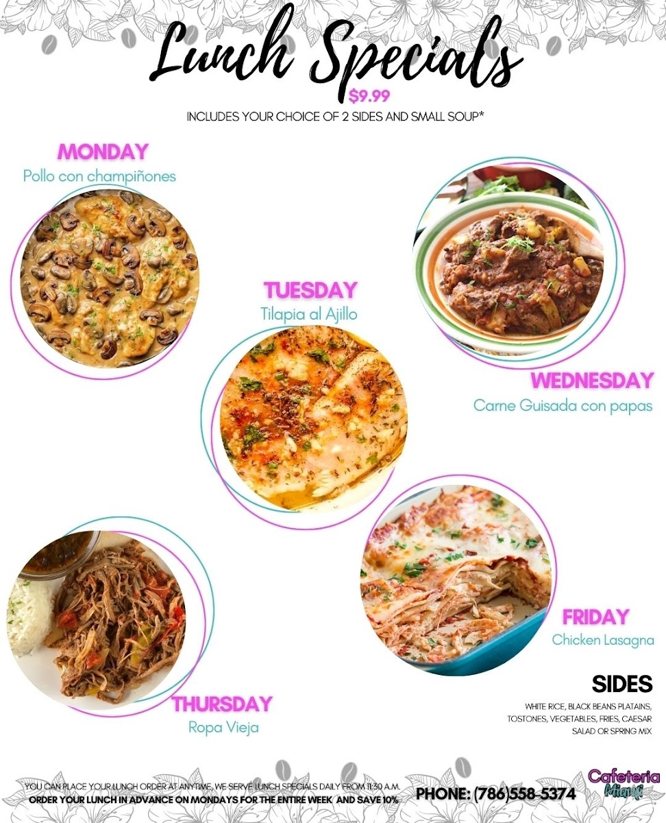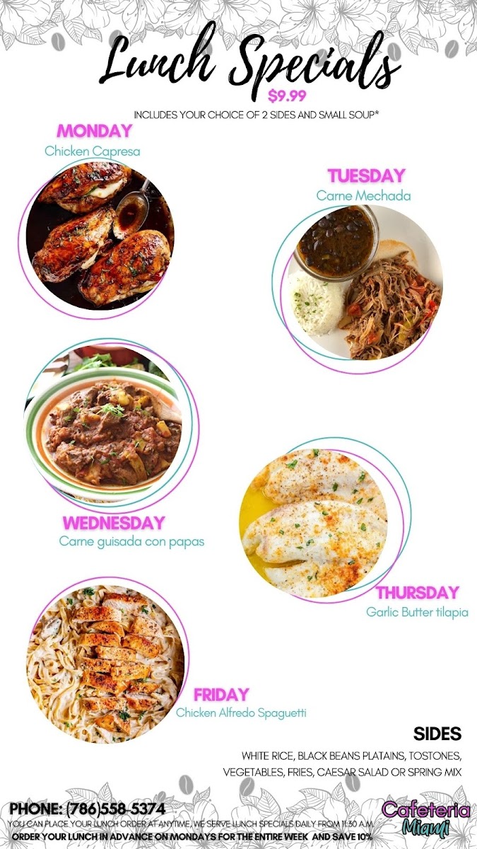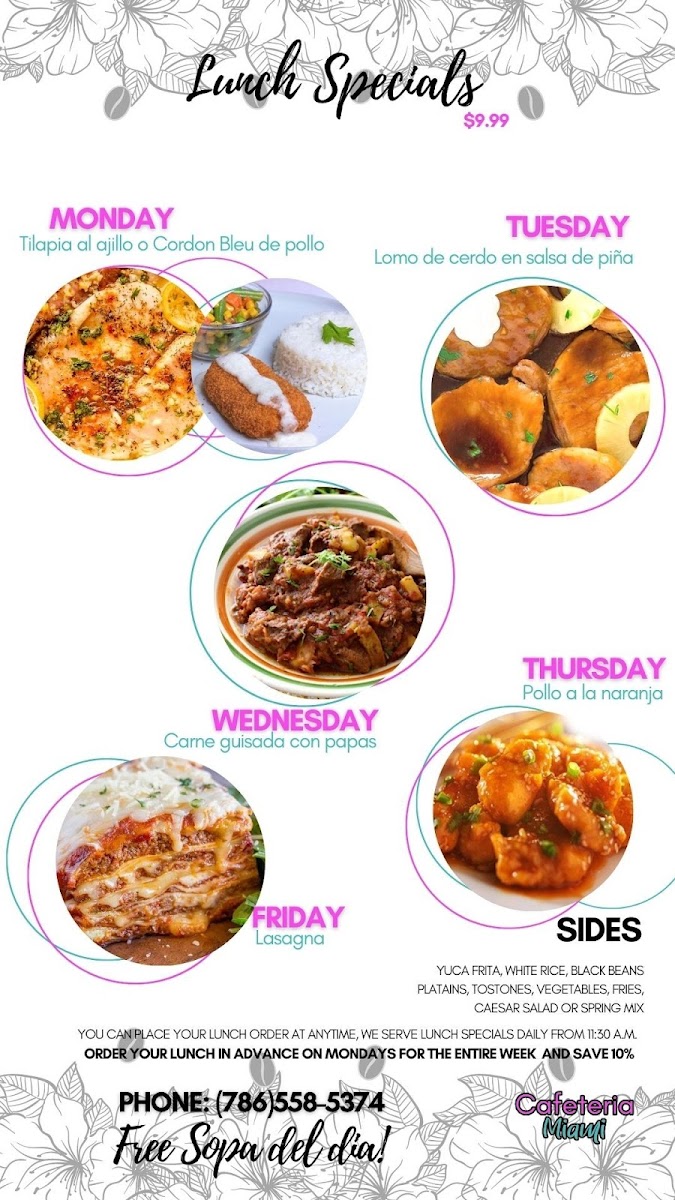 The menu at Cafeteria Miami offers a wide variety of delicious options that cater to different tastes. For those craving a savory sandwich, choices like the Croissant with Ham and Cheese Sandwich and the Pan Con Bistec Sandwich are popular picks. The Cuban Sandwich and Pan Con Lechon also make great choices for a taste of Cuban flavors. If you're in the mood for breakfast, the 2 Eggs, Ham, and Tostada or the Cuban Breakfast are excellent options to start your day. For a more filling meal, the Salmon Lunch or Palomilla Steak Lunch are satisfying, while the Chicken Cordon Bleu and Pork Chops Lunch are hearty alternatives. In addition, the restaurant offers refreshing natural juices like Strawberry Juice and Mango Juice, and a range of beverages, from Café Latte to Powerade. For dessert, don’t miss the Dulce de Leche Marquesa or the indulgent Nutella Marquesa. Whether you're stopping by for a quick bite or a full meal, Cafeteria Miami has a diverse selection to enjoy.